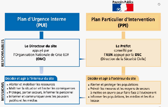Lors du déclenchement d’un des deux plans d’urgence interne, au niveau local, un poste de commandement est mis en place pour ramener le plus rapidement possible la centrale dans un état sûr et pour limiter les différentes conséquences possibles sur l’environnement et sur l’Homme. Alors qu’au niveau national, lorsqu'un des deux plans est déclenché, des experts spécialisés dans la gestion des situations d’accident interviennent. Les pouvoirs publics sont d’abord prévenus puis les médias et le grand public le sont à leur tour.